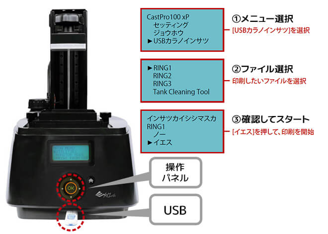 いよいよ造形開始です。USBから造形データを選択し、「OK」ボタンで造形を開始します。