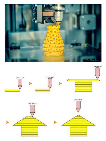 FFF方式では、プラスティックの樹脂を溶かして、ヘッドから吹き出し、一層一層積み上げて形を作っていきます。